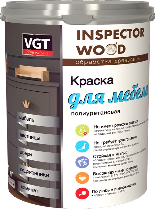 VGT Краска для мебели полиуретановая супербелая база А, 1кг 11607706 Высокопрочная полиуретановая краска предназначена к применению в мебельной промышленности для окрашивания столов, стульев, кроватей, в т.ч. детских, кухонной мебели, мебели для ванных комнат и прочей мебели из различных пород древесины, МДФ, ДСП, ДВП, натуральных и искусственных шпонов, пленок ПВХ.