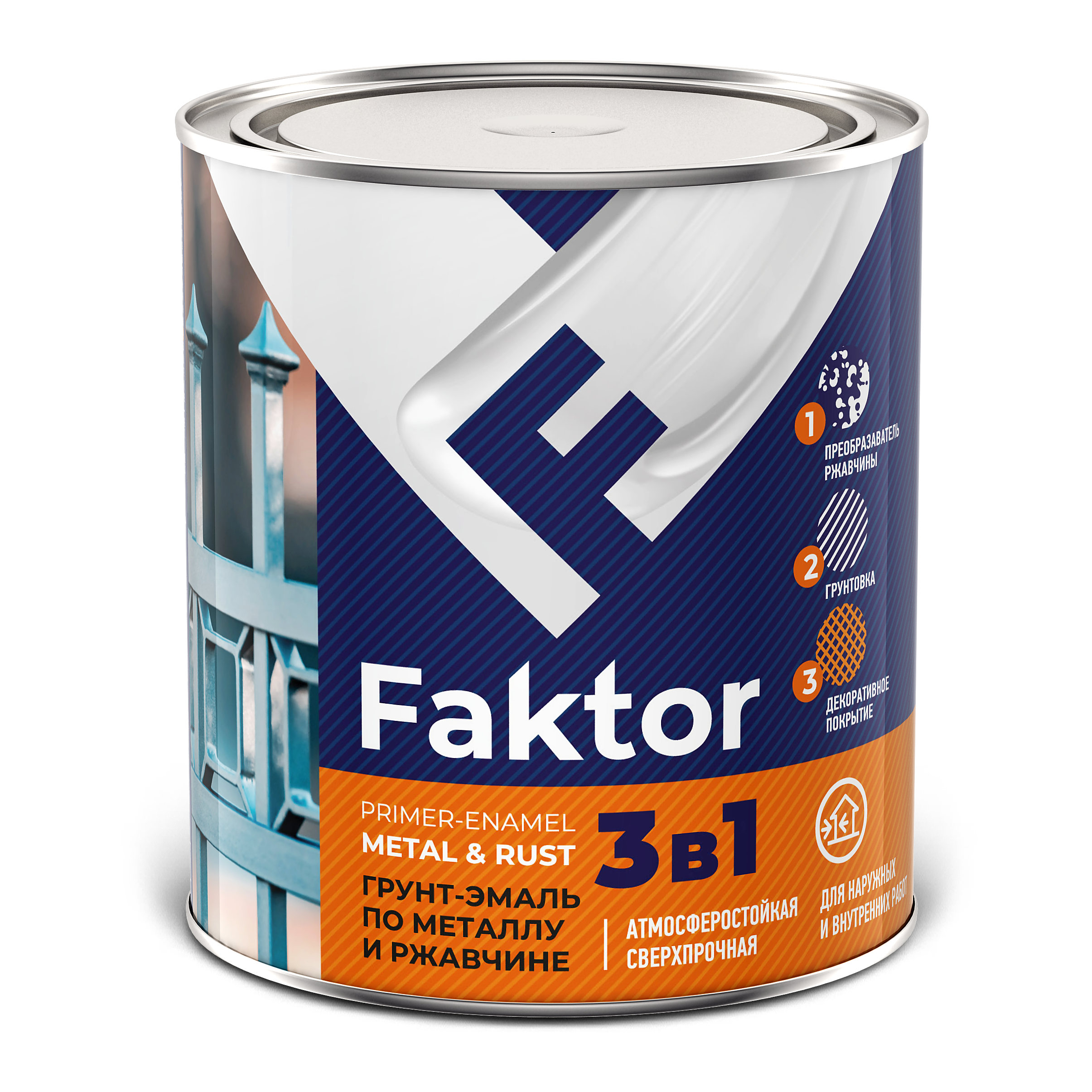 Грунт-эмаль на ржавчину FAKTOR 3 в 1 предназначена для преобразования ржавчины, грунтования и окраски чистых и ржавых металлических поверхностей, включая крупногабаритные конструкции, изделия сложной конфигурации (трубы, мебель, решетки, ограды и т.д.), эксплуатируемые снаружи и внутри помещений.