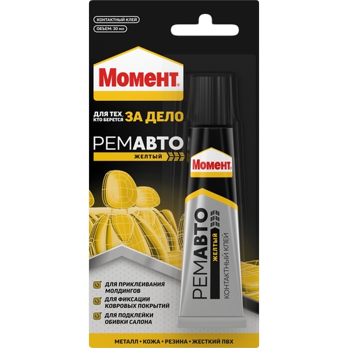 Контактный клей Момент Ремавто 30 мл идеален для локального авторемонта: приклеивания молдингов, подклейки обивки салона, фиксации ковровых покрытий. Теплостойкость клеевого шва от -40°C до +90°C. Высокая прочность склеивания. Надежный и эластичный. Устойчив к старению. Устойчив к воздействию воды, нефтепродуктов, разбавленных растворов кислот и щелочей.