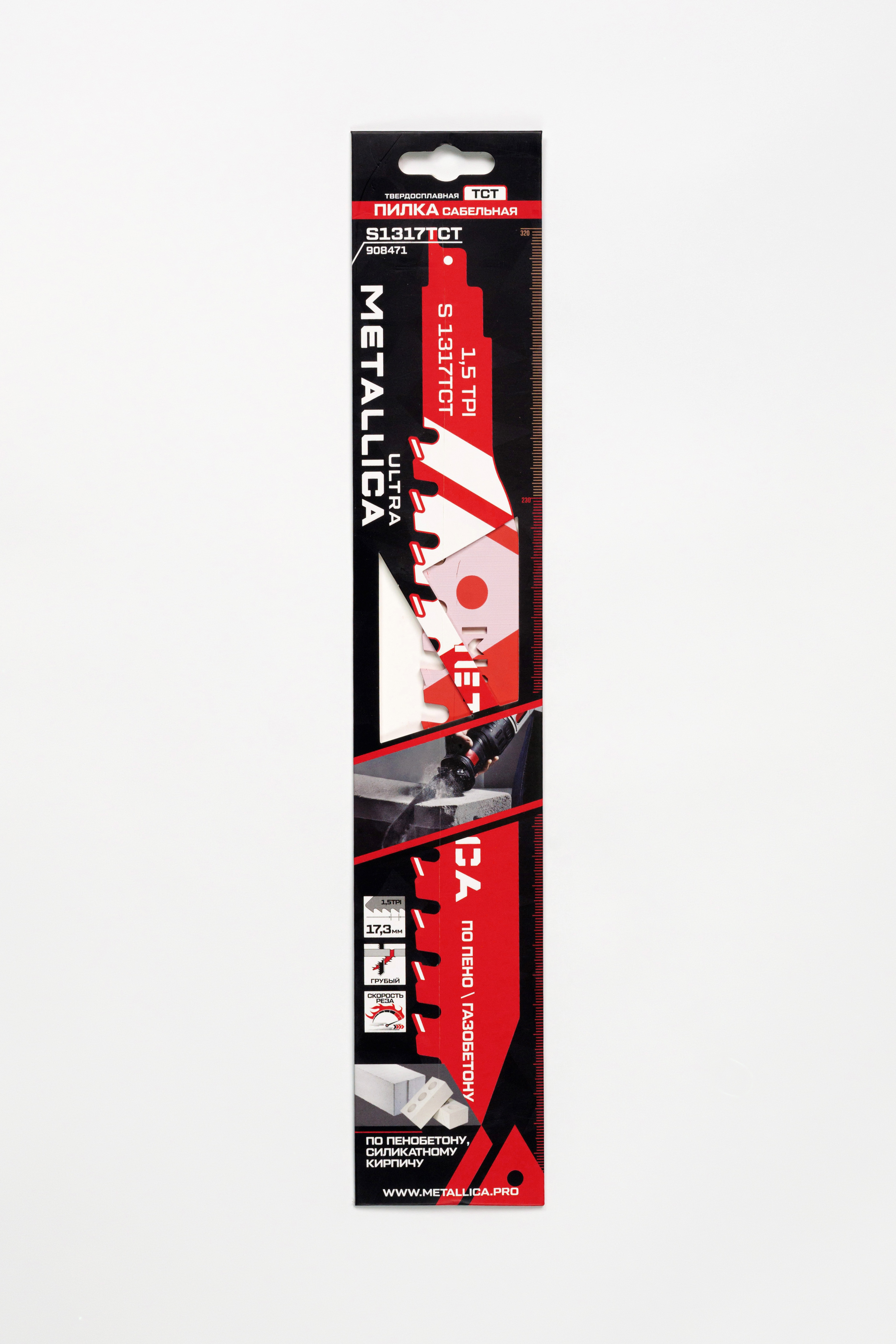 Пилки сабельные METALLICA Ultra S1317TCT 320/230мм шаг 17,3мм, TCT применяются для разрезания газобетона, пенобетона, шлакоблоков, силикатного кирпича. Имеет универсальный h-образный хвостовик. Поставляется в картонном подвесе. Карбид-вольфрамовые напайки обладают высокой износостойкостью.