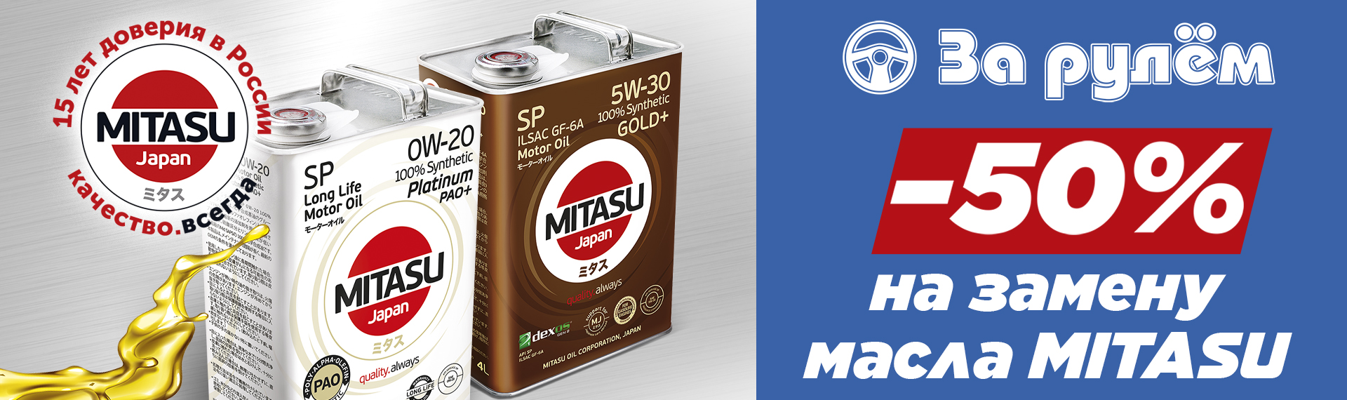 При покупке от 4 литров моторного масла MITASU в сети магазинов «За Рулем» вы получаете купон на СКИДКУ 50% на замену масла в СТО.
