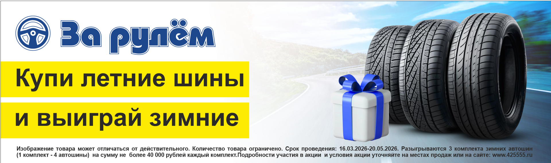 Соверши покупку комплекта автошин (1 комплект – 4 автошины) в магазинах «За Рулем». На оборотной стороне купона, выданного на кассе, заполни (ФИО и телефон) и скинь в специальный ящик до 21.05.2026г. Кассовый чек необходимо сохранить!